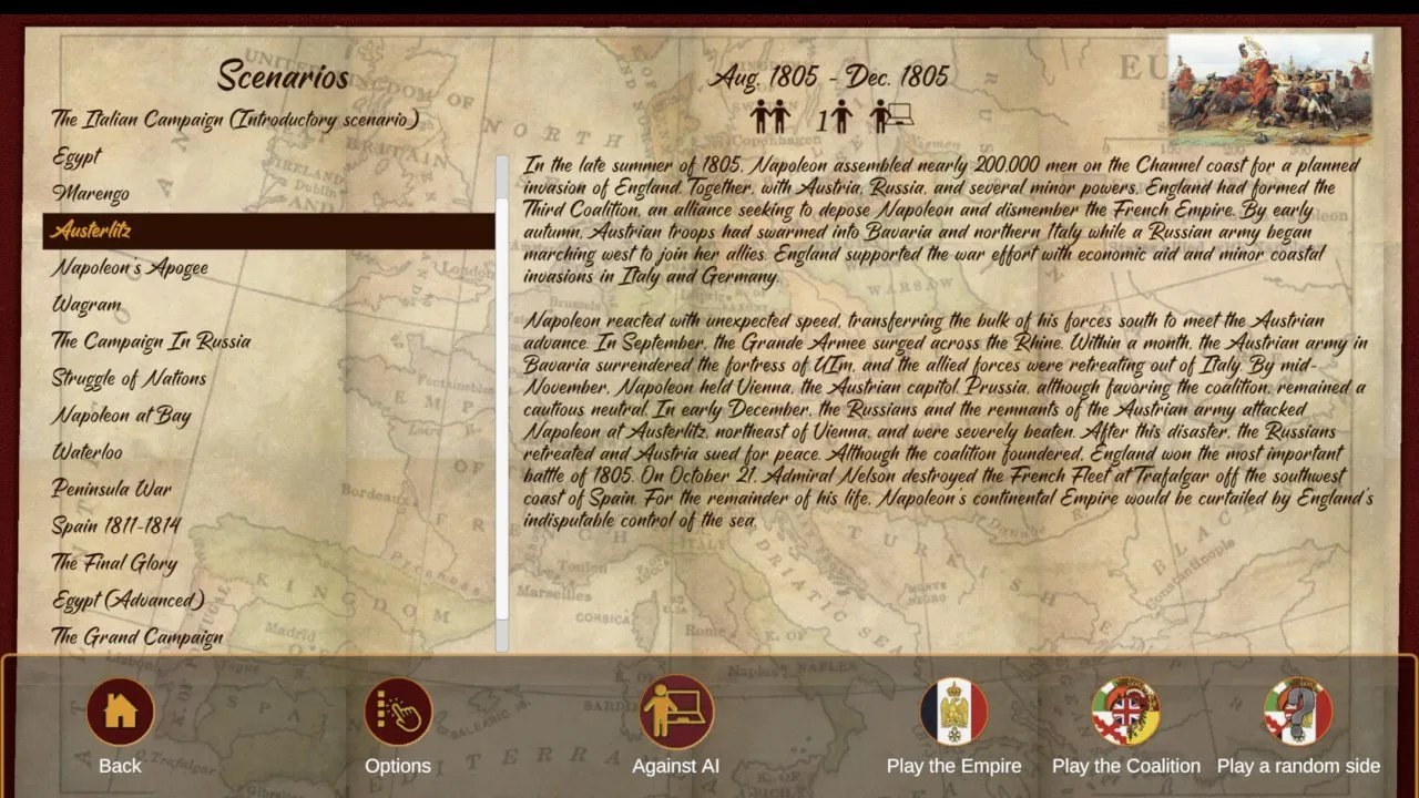 В игре разработано множество сценариев, которые демонстрируют известные сражения в период с 1796 по 1815 год. Возьмите на себя управление легендарными генералами, попробовав роль Наполеона или Веллингтона. Между сражениями, придется заниматься разработкой плана битвы, прокладывать маршрут по карте, и научиться мыслить стратегически. В этом вопросе важно правильно расставить приоритеты: заняться обороной, кинуть силы на нападение или организовать логистику.