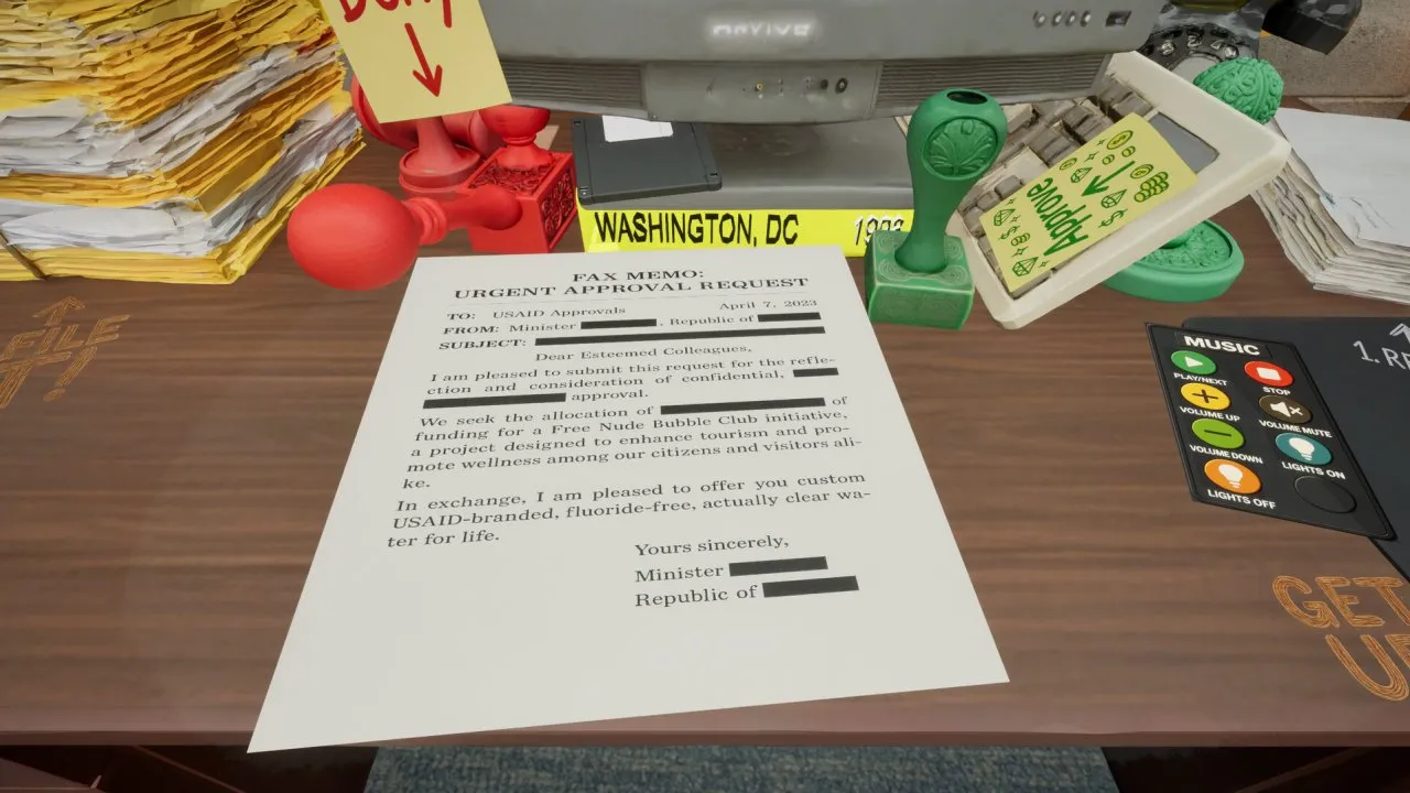 USAID Approvals Department – сатирический симулятор, в котором вы увидите тонкую грань между госслужбой и хаосом. Одобряйте странные заявки, получайте глупые бонусы и постарайтесь сбежать до момента, когда к вам нагрянут проверяющие.