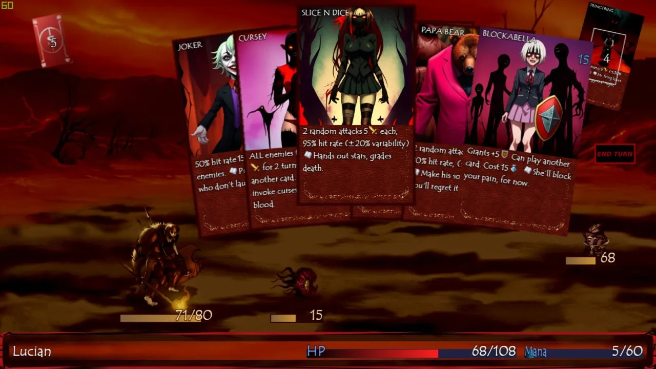 - Битвы идут пошагово, есть демоны. И все это ведется на основе колоды, событий, что происходят случайно;